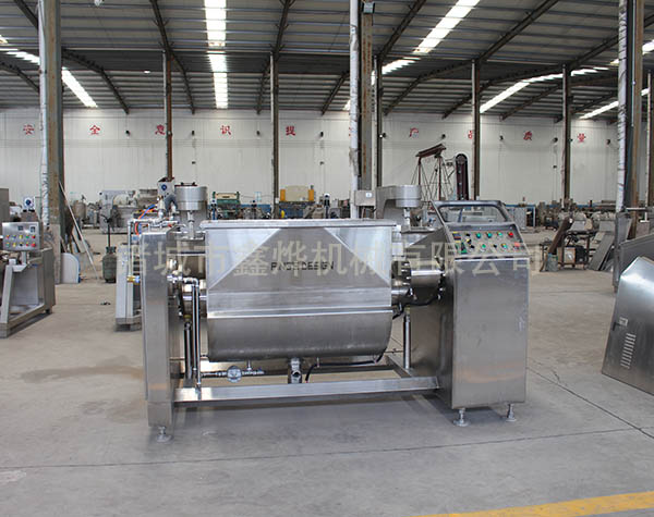 本機的U形鍋頂部抽真空,夾套采用蒸汽加熱,無段變速與蝸輪,減速機的組合傳動,增大了橫軸攪拌的力矩,采用食品級材質(zhì)材質(zhì)刮板的攪拌器,在物料的翻滾攪拌過程中,攪拌器與鍋體的充分接觸,確保了無攪拌死角。鍋體的開蓋,卸料,復位采用液壓,機械傳動控制,操作方便。真空炒制可降低炒制溫度,特別適應(yīng)于高粘度材料的炒制,避免了因過度受熱引起色澤及口味的變化,保持了物料原有的色香味。提高了炒制效率,并降低能耗,縮短了炒制時間。
